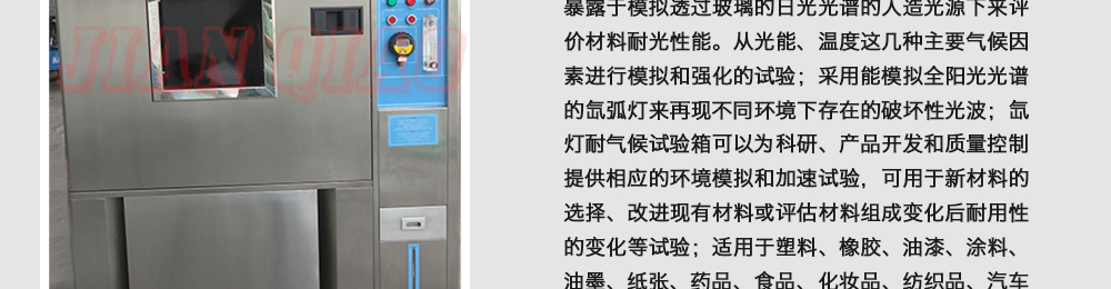 產(chǎn)品型號(hào):JQ-3F-100 品牌:劍 喬 用途:氙燈老化試驗(yàn)箱,氙燈耐候試驗(yàn)箱,氙燈光老化試驗(yàn)機(jī)是一種綜合氣候試驗(yàn)裝置,除進(jìn)行氣候老化試驗(yàn)外還可進(jìn)行高分材料的耐光性的測(cè)試,即高分子材料暴露于模擬透過(guò)玻璃的日光光譜的咨詢熱線:13829135130
