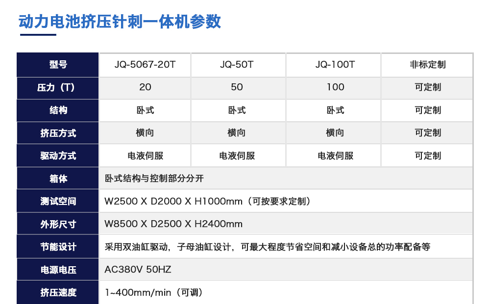 產(chǎn)品型號:JQ-5067-20T(可定制) 品牌:劍 喬 用途:動力電池擠壓針刺一體機模擬各類動力鋰電池組在使用過程中,電池包遭受擠壓的情形,人工呈現(xiàn)電池在遭受擠壓時可能出現(xiàn)的不同狀況。 原理:電池包擠壓試驗機將電池放在連個擠壓咨詢熱線:13829135130