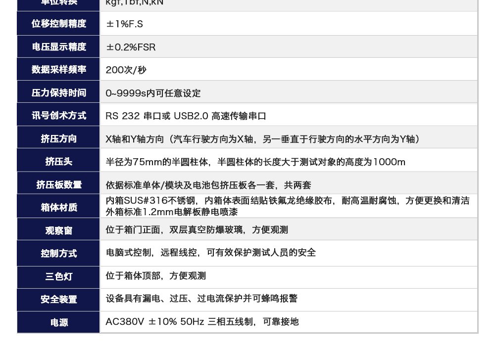 產(chǎn)品型號:JQ-5067-AL20 品牌:劍 喬 用途:電池包擠壓試驗機模擬各類動力動力電池包和系統(tǒng)在運輸、儲存及使用過程中電池包遭受碰撞擠壓的情形,人工呈現(xiàn)電池在遭受擠壓時可能出現(xiàn)的不同狀況。咨詢熱線:13829135130