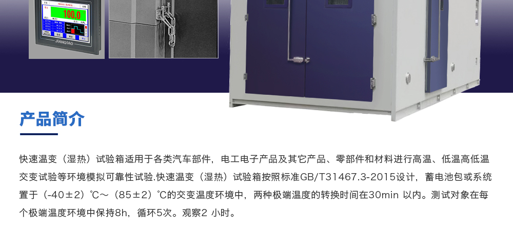 產品型號:JQ-12㎡(定制款) 品牌:劍 喬 用途:快速溫變(濕熱)試驗箱適用于各類汽車部件,電工電子產品及其它產品、零部件和材料進行高溫、低溫高低溫交變試驗等環境模擬可靠性試驗.快速溫變(濕熱)試驗箱按照標準GB/T31咨詢熱線:13829135130