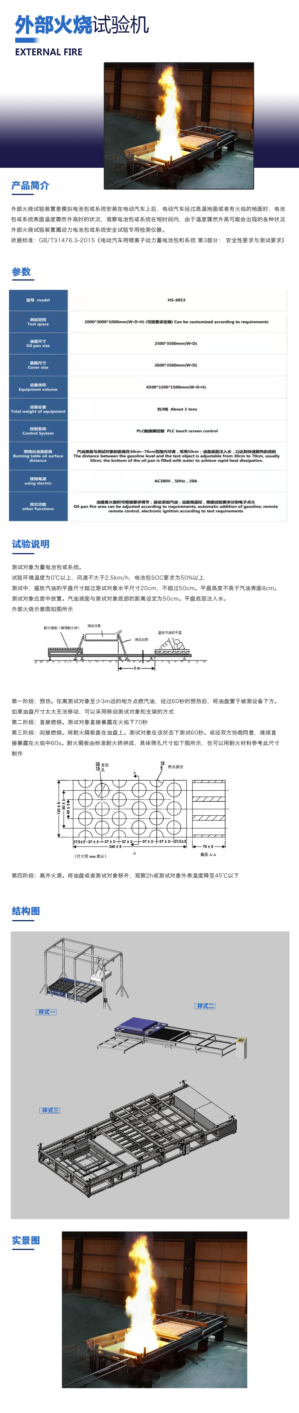 產品型號:JQ-8202-2500 品牌:劍 喬 用途:外部火燒試驗裝置是模擬電池包或系統安裝在電動汽車上后,電動汽車經過高溫地面或者有火焰的地面時,電池包或系統表面溫度驟然升高時的狀況,觀察電池包或系統在短時間內,由咨詢熱線:13829135130